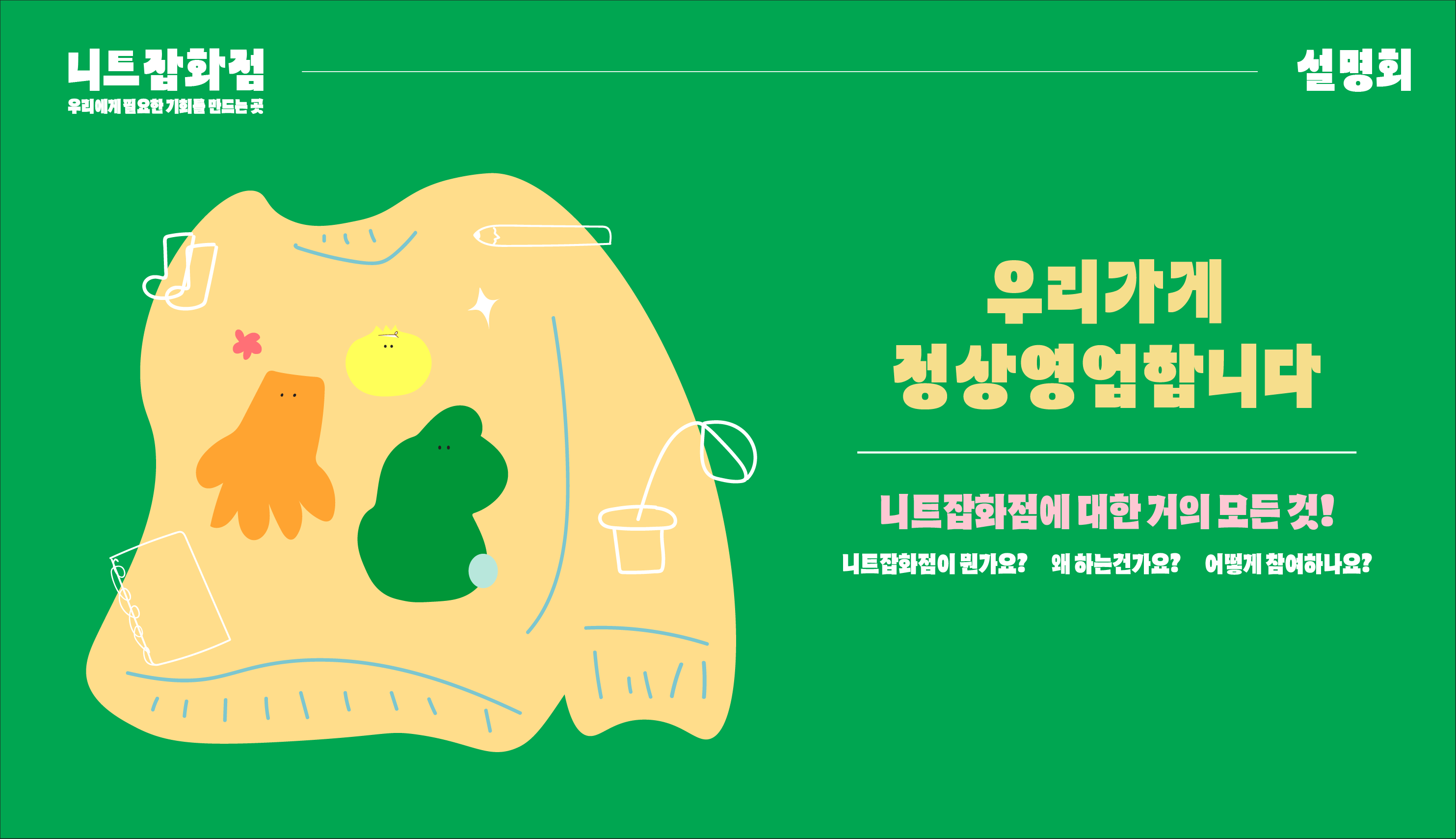 니트잡화점이 어떤식으로 진행되는 건지 궁금해서 신청했습니다. 운영진분들의 소개를 듣고, 준비해주신 PPT와 설명덕분에 궁금증이 해결되었어요. 감사합니다. 설명 후, 질문을 꼼꼼히 읽어봐주시고 운영진분들이 플리마켓을 나갔던 경험을 비추어 답변해주셔서 좋았습니다. 니트잡화점에 참여할 기회가 있다면 참여해보고 싶네요!
