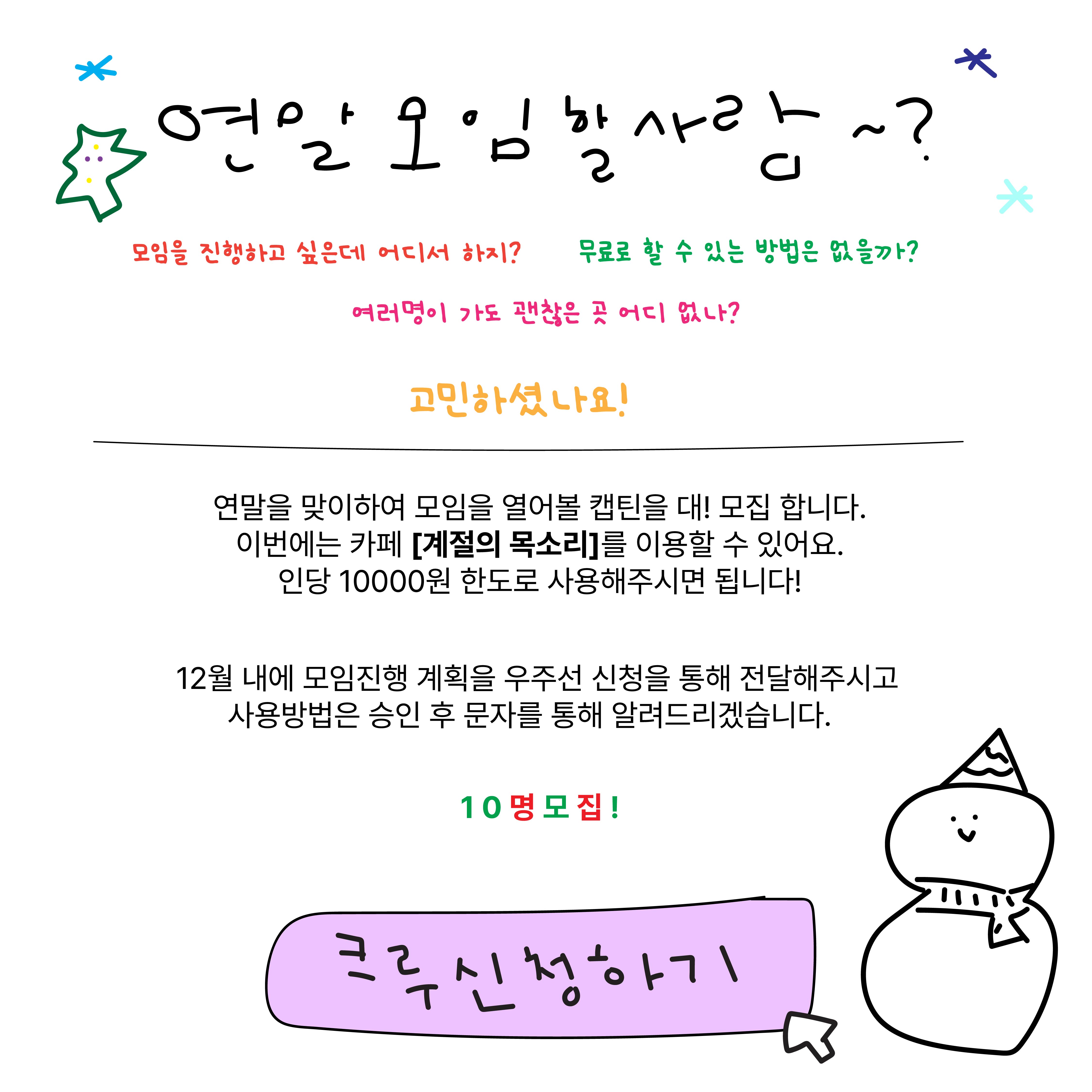 - 연말모임 캡틴구함 크루신청을 해주세요. 모임 인원은 최소 3명부터 가능해요!