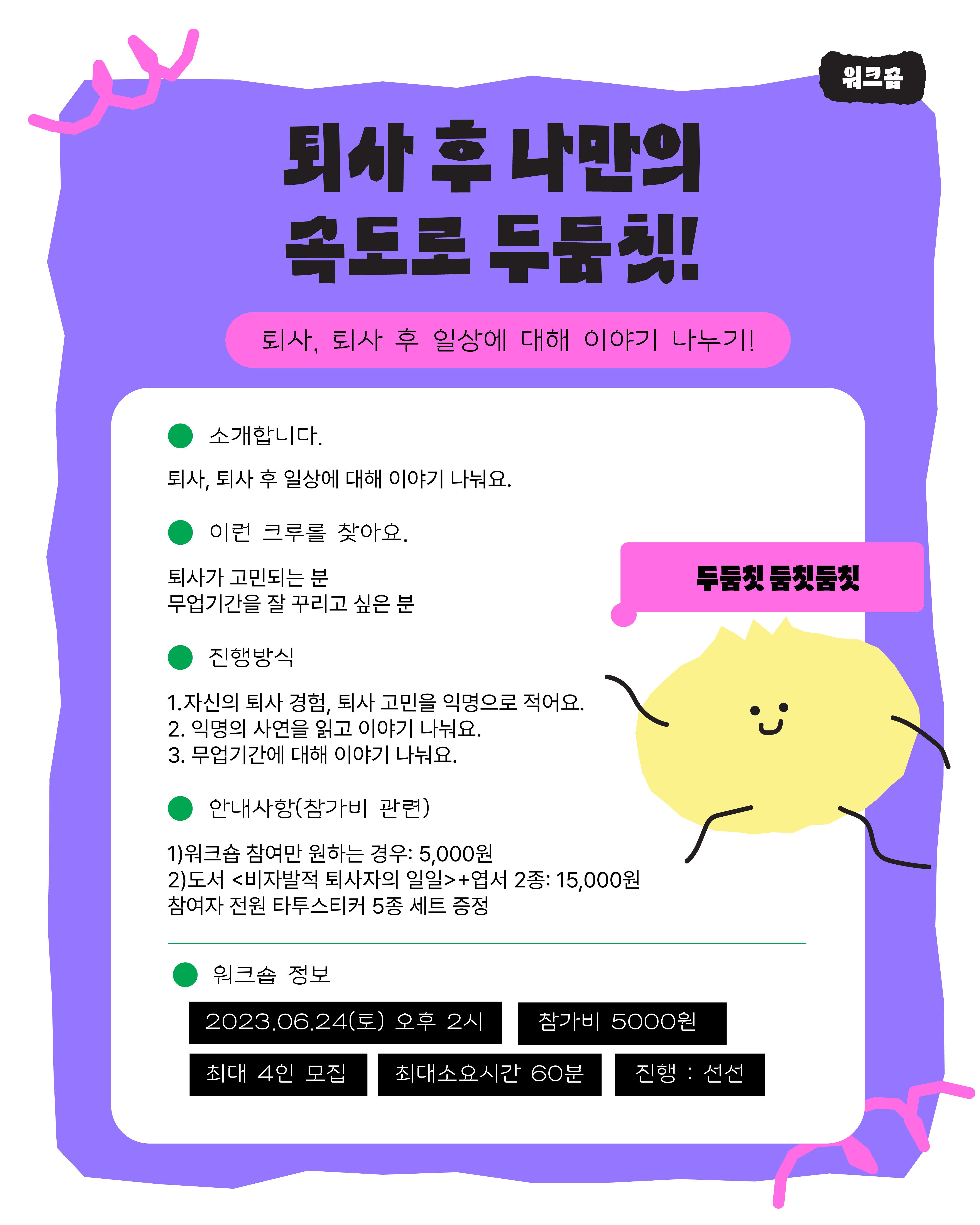 5. 워크숍 진행자 대부분이 전문적인 강사인력이 아닌, 자신의 일을 찾아가는 단계의 청년들입니다. 다소 서툰 부분이 있을 수 있으니 조금만 양해해주시면 감사하겠습니다.